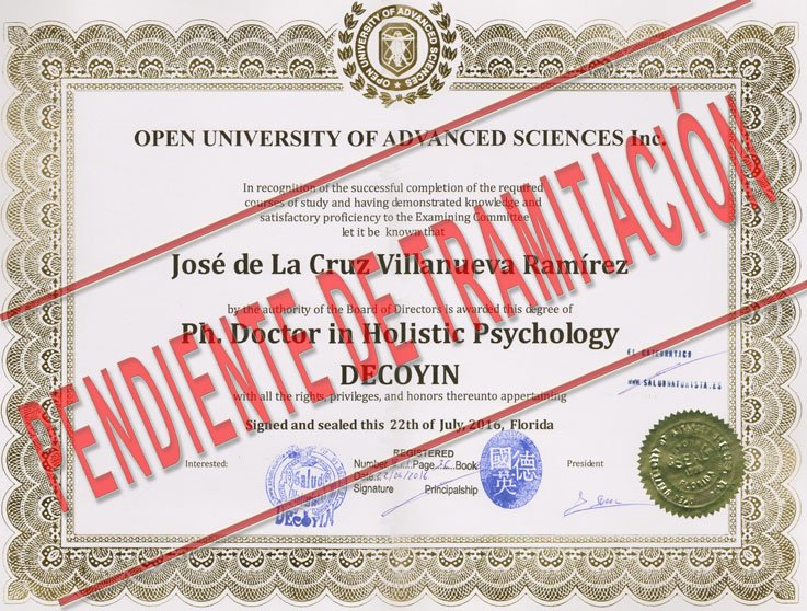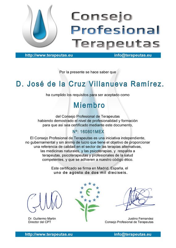 Desde el marco de colaboraciones de la Facultad de Salud Naturista DECOYÍN, del Rectorado de la Universidad OUAS, de la Escuela de Psicología Holística DECOYÍN, la Iglesia de la Filosofía del Espíritu y Radio Salud Naturista se tiene a bien conceder la credencial de Miembro de Honor de Méritos y Colaborador a D. José de la Cruz Villanueva Ramírez, Rector General de la Universidad Nacional UNCEMA. |