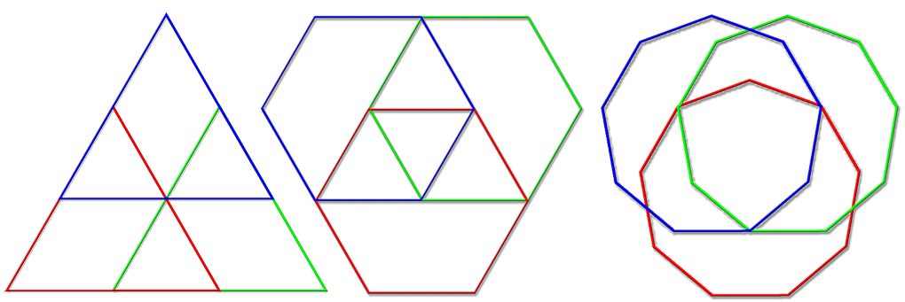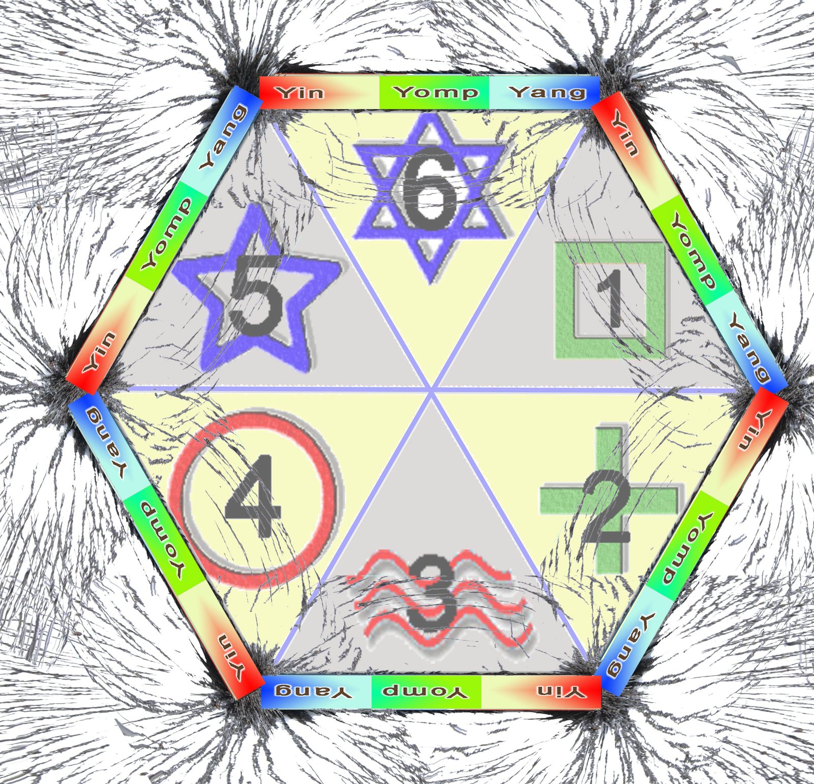 3- Pero la Creación o manifestación de la sabiduría Divina no se da realmente en la dualidad Yin-Yang de las causas, ya que todo contiene una tercera dimensión Yomp o neutra que actúa a modo de efectos, lo que cambia la perspectiva para la formación de un circuito cerrado, que ahora su estado de equilibrio se representará en forma de la Trinidad Dualificada del 3 x 2 = 6 (hexágono), como representación de todo lo que concierne a la verdadera humanidad. 6 lados y 60º. Cada triangulo interior que se conforma representa a uno de los 6 Tipogramas Duales de la Psicorecoherenciación, cuyas características y cometidos se estudia de dicha materia. |