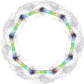 1- Todo empieza en la dualidad Yin-Yang que permite la creación de la energía, que compone todo el mundo material humano. Y para ello, se ha de expresar en la linealidad abierta, que deje expuestos sus polos opuestos, como generadores de dicha energía, que fluya en todas las direcciones. Pues aunque en el dibujo observamos el flujo sobre un plano, este campo magnético de energías sucede en todos los restantes planos tridimensionales. |