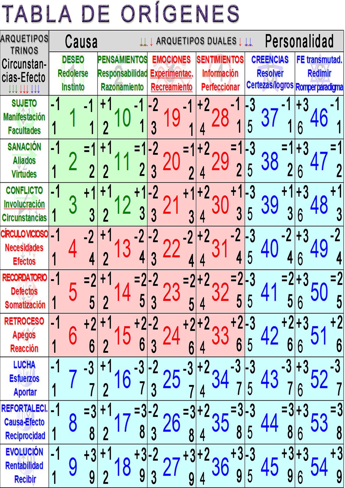 Esta tabla de Orígenes, en su confluencia del Arquetipo Dual con el Trino no aporta un resultado añadido, sino numerológico, por lo que se ha acceder a la comuna de la derecha. Ejemplo: Se obtuvo el Arquetipo Dual 4 (círculo) con el Arquetipo Trino 6 (rombo) = Tipograma 33 = 3+3 = 6 = 1. Hipocondría. 2. Huye de las situaciones difíciles. 3. Indolencia (no se afecta o conmueve). 4. Lucha por los otro pero no para sí mismo. 5. Obsesivo y posesivo. 6. Pasividad. 7. Pereza. 8. Pesimismo. 9. Se complica con problemas imaginarios. 10. Sentimentalmente absorbente. 11. Usado y abusado a veces. 12. Abnegación. 13. Adaptabilidad. 14. Amor. 15. Aptitudes artísticas 16. Armonía. 17. Comprensión. 18. Cooperación. 19. Credulidad. 20. Emotividad. 21. Equilibrio. 22. Generosidad. 23. Prudencia. 24. Responsabilidad y sacrificio hacia las obligaciones familiares. 25. Sensibilidad. 26. Sentimental. 27. Seriedad. 28. Sociabilidad.