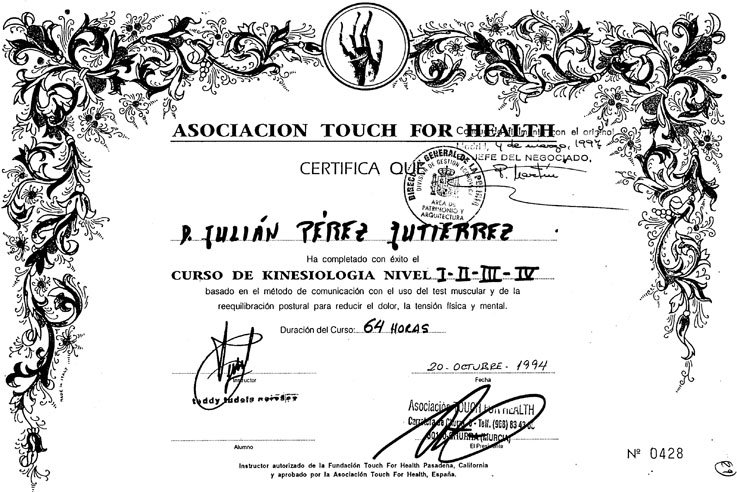 Cinco años después, con intención de entender el motivo de las causas que generaban la somatización, realicé los 4 niveles en Kinesiología que culminaran, por esas fechas, con estudios de radiestesia terapéuticas. |