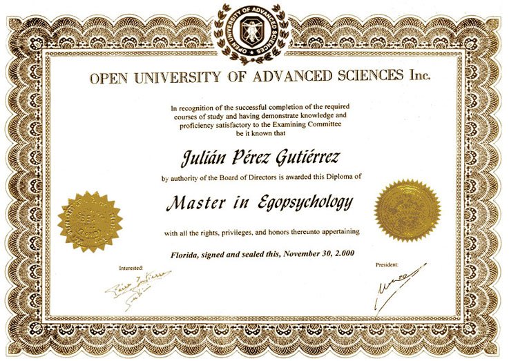 Como especializaciones de esta disciplina se obtuvieron el Master en Egopsicología el 30 de noviembre de 2000