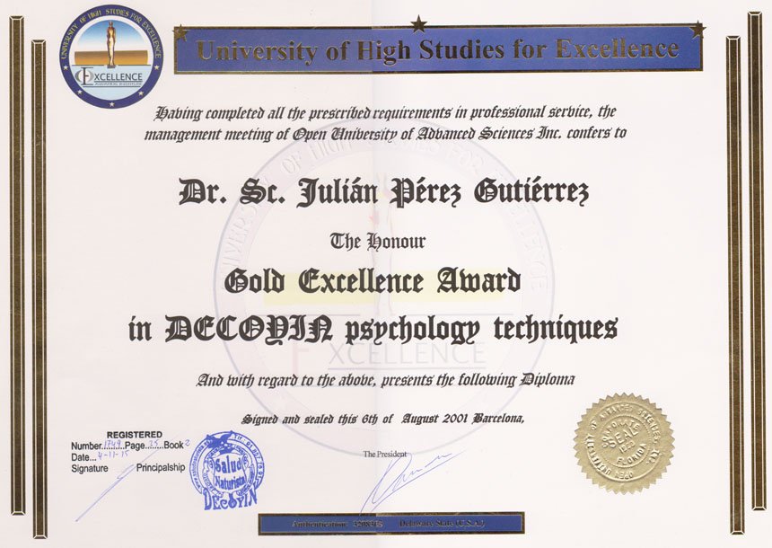 El Premio de Oro de la Excelencia en Técnicas de Psicología DECOYIN. |