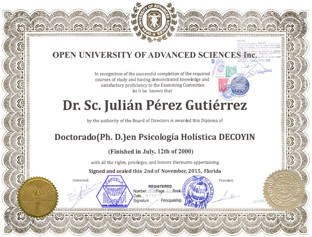 Las acreditaciones en Psicología Holística DECOYIN se inician con la consecución del Doctorado Académico por el Presidente de la Escuela, el 12 de junio del 2000.