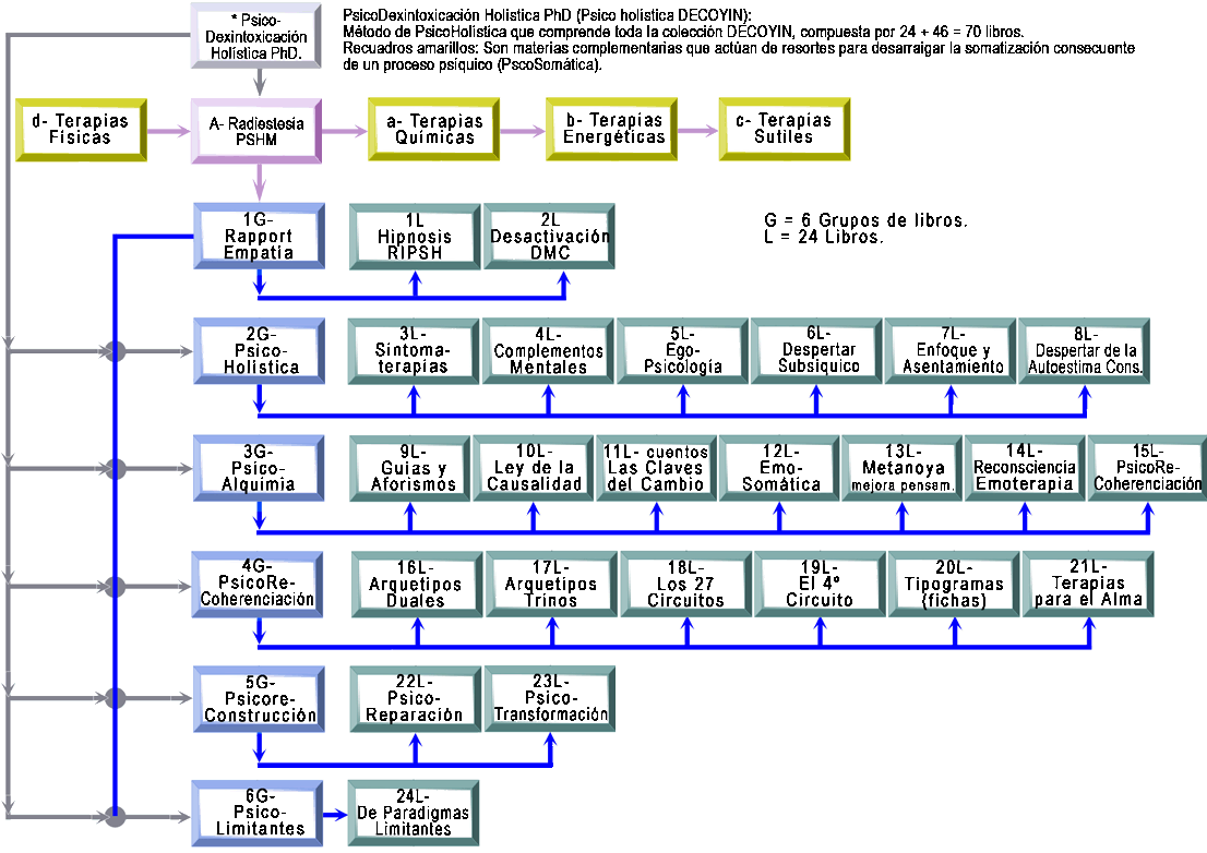 Escuela de Psicología Holística DECOYIN (PhD): Fundamentada en un compendio de los 25 libros de Psicología Holística Decoyin, junto con otros 46 libros de apoyo, lo que conforman un total de 73 libros del área de las terapias alternativas (Salud Naturista), escritos por el Catedrático, Decano y Rector de la Universidad OUAS, el Dr. Sc. Julián Pérez Gutiérrez. En el esquema expuesto más abajo, sobre este compendio de libros, se expone también como se interrelacionan entre sí. Este compendio de libros de texto, ha sido especialmente diseñados para formar al alumno hasta un posible nivel de doctorado, durante 7 a 10 años de formación, consolidando así no solo la parte formativa del alumno, sino su propio desarrollo y evolución interior. |