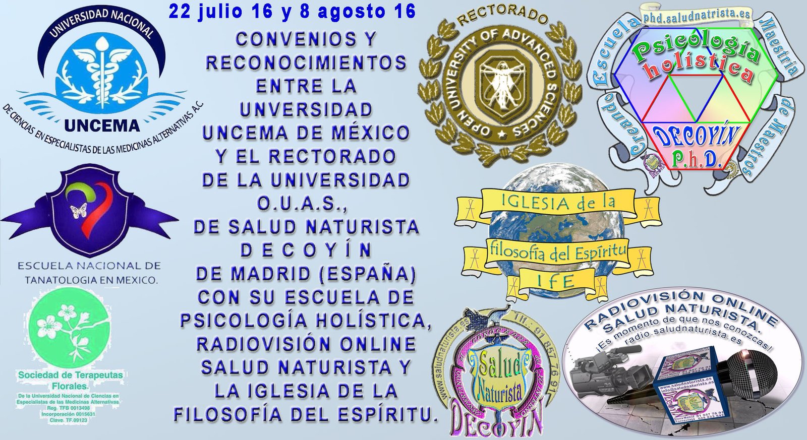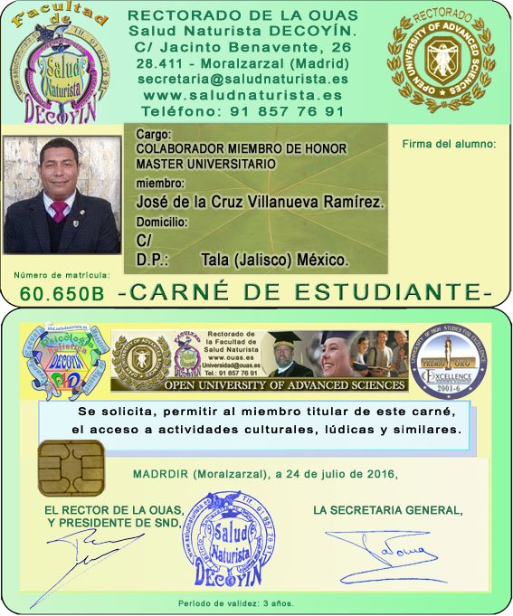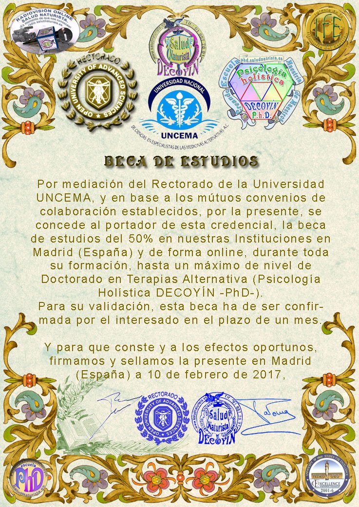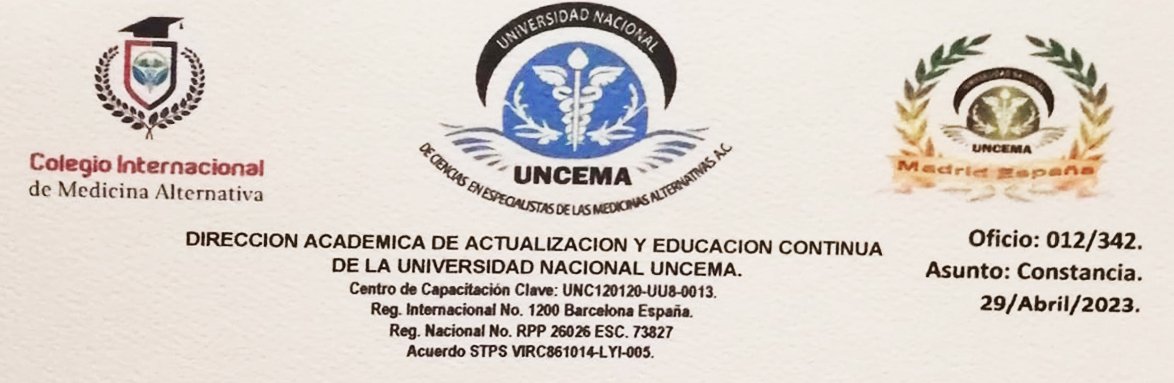 53H. Universidad Nacional UNCEMA: Fue Fundada en Enero del 2012, Bajo el permiso de la Secretaria de Relaciones Exteriores y Registrada legalmente ante el notario Público No 01 de Tala Jalisco México, Lic. Eleno Vega Guerrero, bajo el número de escritura 73827, y debidamente registrada en el registro público de propiedad en Jalisco, bajo el numeral 26026. Así mismo el día 17 de Febrero del 2022 se concede; revisada, la documentación legal y fiscal, la CONSTANCIA DE LA STPS COMO CENTRO DE CAPACITACIÓN Y FORMACIÓN CON NUMERO DE REGISTRO UNC-120120-UUa-0013. De conformidad como lo marcan los artículos 153c y 153p de a Ley de STPS Elevando con ello la categoría de CENTRO DE FORMACIÓN Y CAPACITACIÓN. Programas presentados a la Dirección General de Capacitación y Productividad de la STPS. Cuenta con doble registro puesto que nuestro RECTOR, cuenta con registro particular para respaldar con valor curricular los documentos que con su firma autógrafa otorga No de reg. VIRC861014-L Y1-005. Así mismo, en Mayo del 2012, se concede la incorporación internacional ante la APENB (Asociación Profesional Española de Naturopatía y Bioterapia) de Barcelona España, con registro Internacional No 1200 México-España. De conformidad con lo dispuesto en nuestra constitución legal y fiscalmente constituida, al igual como lo estipula el código de Ética y Reglamento de la Universidad. El Mtro. José de la Cruz Villanueva Ramírez, es la primera autoridad administrativa de esta institución, bajo la autoridad administrativa de esta institución, bajo la Autoridad, Moral, legal y Académica que le confiere. |