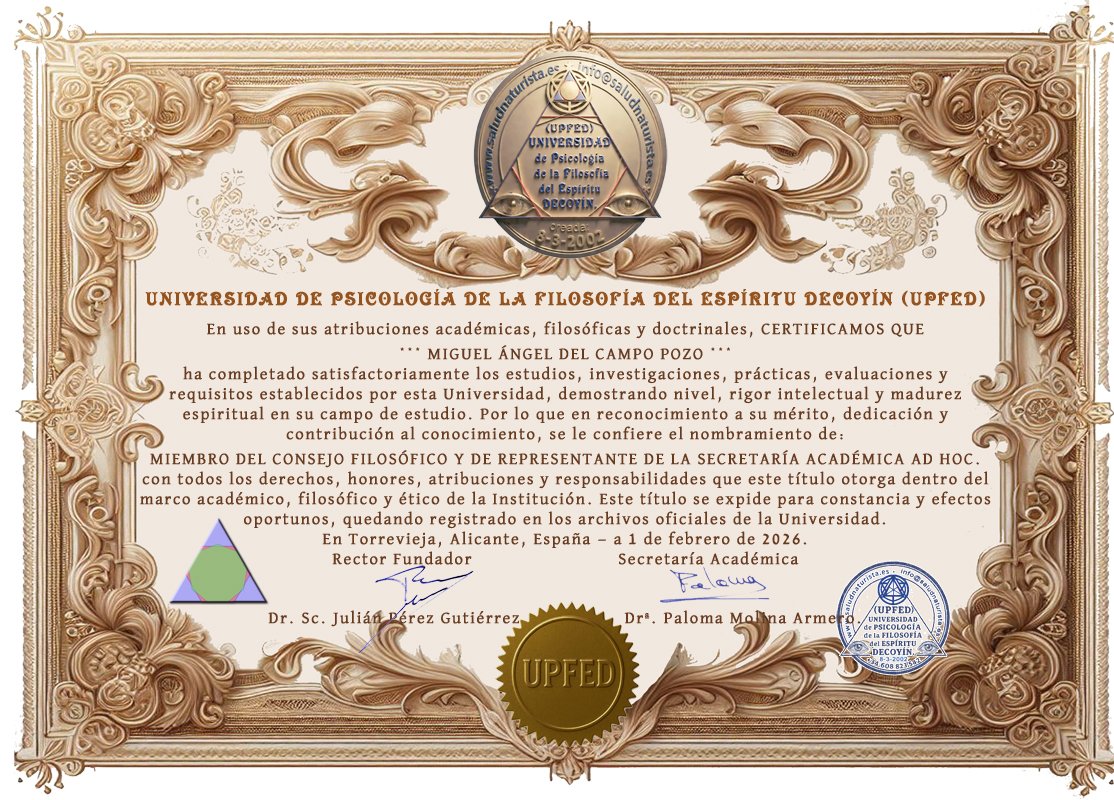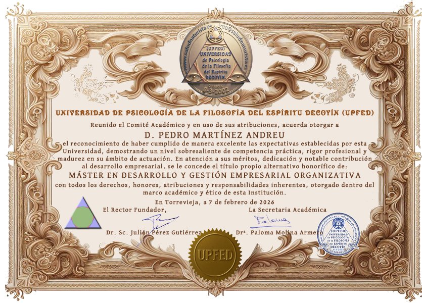 Los títulos propios que se conceden pueden llegar hasta el grado de Doctorado, Post-Doctorado y Excelencia. Se basan en los 64 libros de la colección DECOYÍN -Mentales-, y otro tantos de libros que conforman las otras áreas de formación establecidas en seis Facultades. Pero también se conceden títulos honoríficos a quien por su praxis demostrada, puede acreditar excelencia en su ámbito laboral. El estatus y confianza de una Universidad se marca con el nivel de las personas que la dirigen. Así, esta Universidad se sustenta en los cimientos que su fundado-rector y dirigente aporta con 9 doctorados, 3 postdoctorados, Académico de Honor, Grand Comander de la Comand Wech, Obispo de la Iglesia GII, Rector y Catedrático, más de 100 libros escrito, más de 1.000 video canciones formativas subidas a Internet, congresos, ponencias, etc. Aunque la Universidad se creó en el 2002, desde el 1 de febrero del 2026 se abre al público en general, debido a la gran necesidad que esta sociedad tiene de alimentar esa Sabiduría Interior que tan poco se sabe valorar y acceder a ella. Ejemplo de una credencial: |