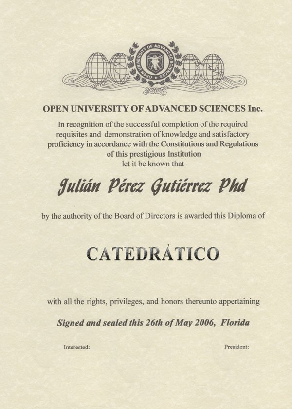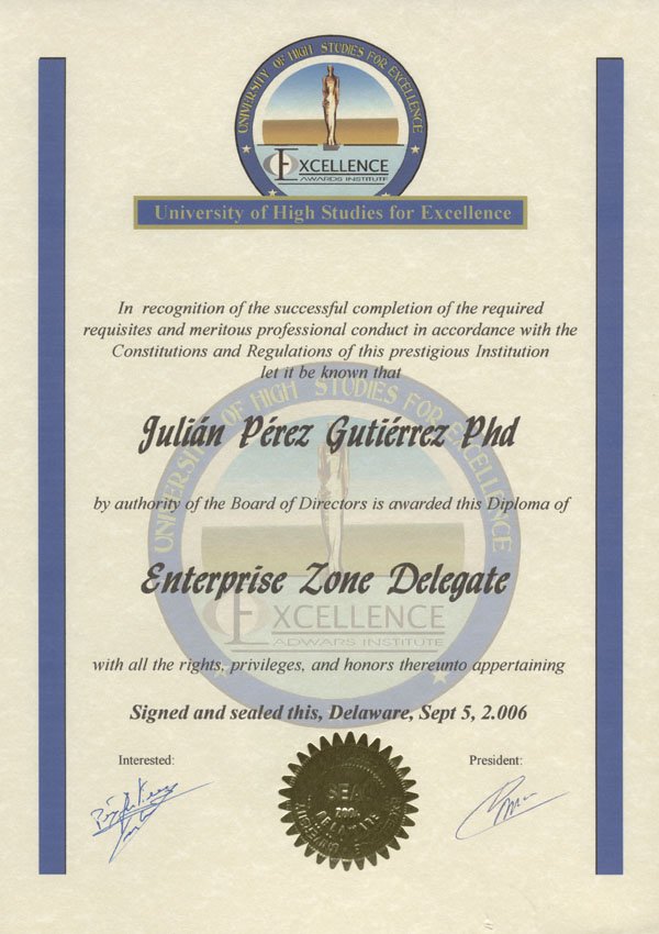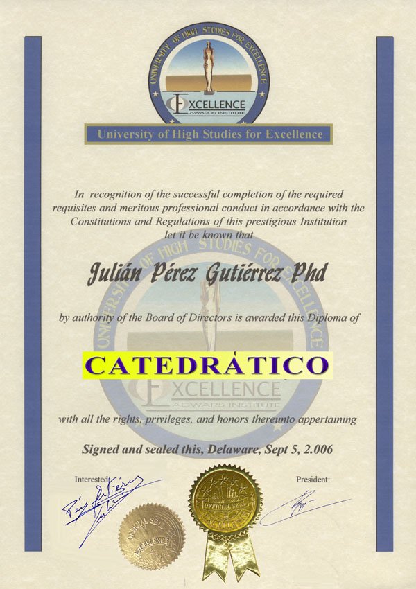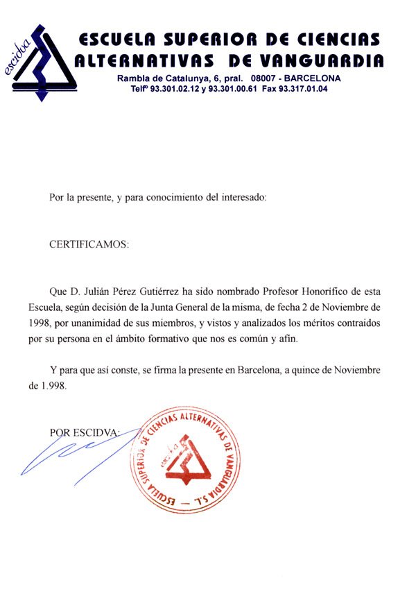 01- PROFESOR HONORÍFICO DE LA ESCUELA SUPERIOR DE CIENCIAS ALTERNATIVAS DE VANGUARDIA. DESDE EL 15-NOV-98. |