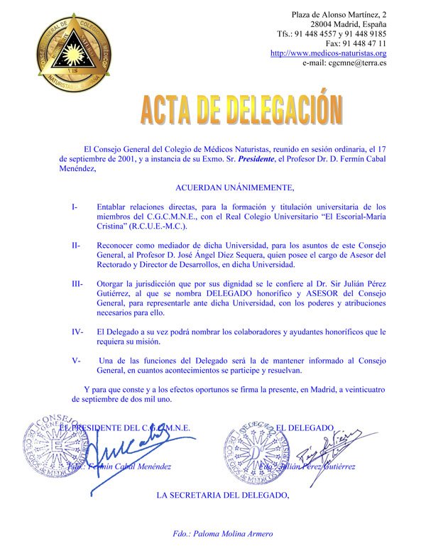 02- DELEGADO DE ASUNTOS UNIVERSITARIOS DEL CONSEJO GENERAL DE COLEGIOS DE MÉDICOS NATURISTAS DE ESPAÑA 28-SEP-01 |