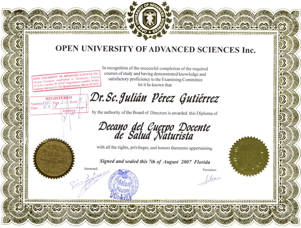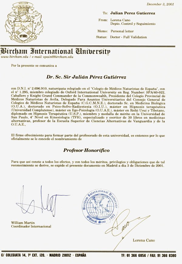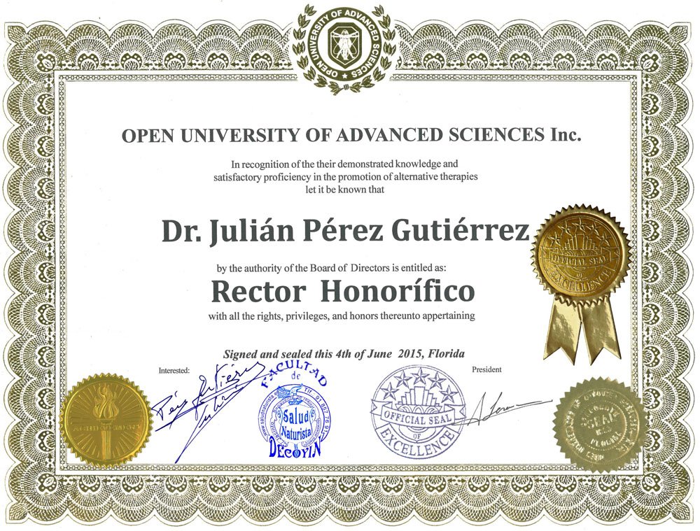 10- RECTOR desde el 04-JUN-15: Representante del RECTORADO de la Cátedra correspondiente a la Facultad de Salud Naturista y Terapias Alternativas o similares, con máxima autoridad en la toma de decisiones, para establecer convenios de colaboración con estamentos públicos y privados, intercambio de alumnos, organizar cursos de postgrado, convalidación de títulos y grados, preparar materias de formación y representar a la Universidad. |