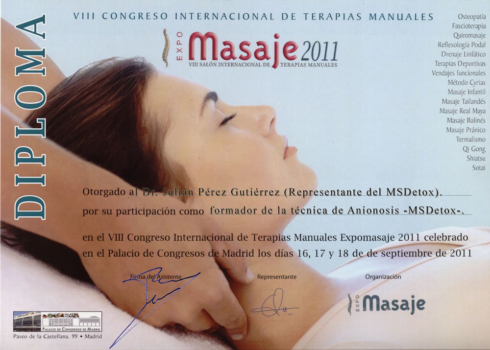 | Ponencia realizada en el V Salón Internacional de Salud, Nutrición y Terapias Naturales, sobre "Terapias Electrolíticas Aniónicas, como sistema de desintoxicación más efectivo y natural", el viernes 15 de octubre de 2010. Y expositor del sistema de desintoxicación MSDetox. Celebrado en le Palacio de Congreos de Madrid. Con mención especial (metopa). |