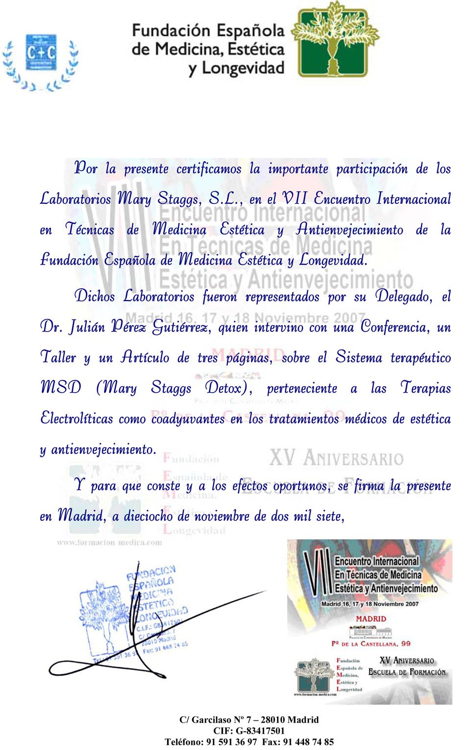 | Ponencia y expositor del VII Encuentro Internacional en Técnicas de Medicina Estética y Antienvejecimiento en el Palacio de Congresos de Madrid los días del 16 al 18 de noviembre de 2007, dirigida por www.formacion-medica.com con mención especial. |