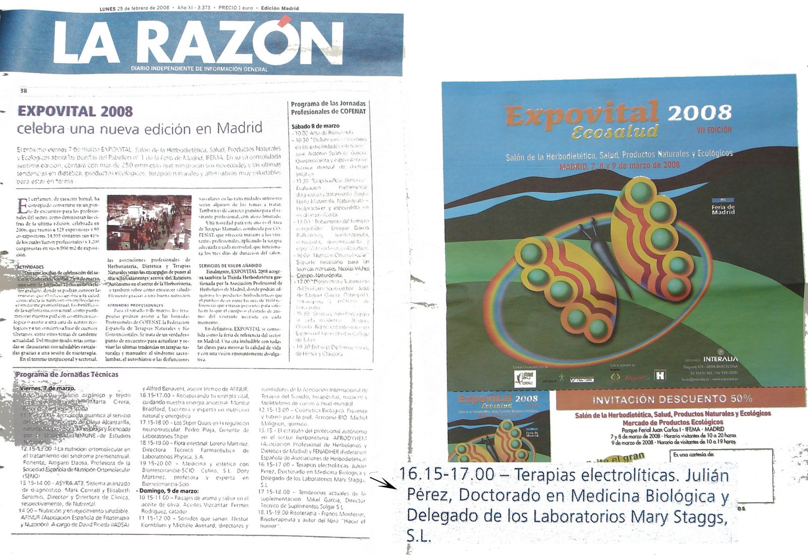 El periódico La Razón del 25 de febrero de 2008, en sus páginas 38 y 39 expone los intervinientes en el Programa de Jornadas Técnicas, entre los que figura para el domingo, 9 de marzo: 16. 15-17.00 - Terapias electrolíticas. Julián Pérez, Doctorado en Medicina Biológica y Delegado de los Laboratorios Mary Staggs, S.L.: