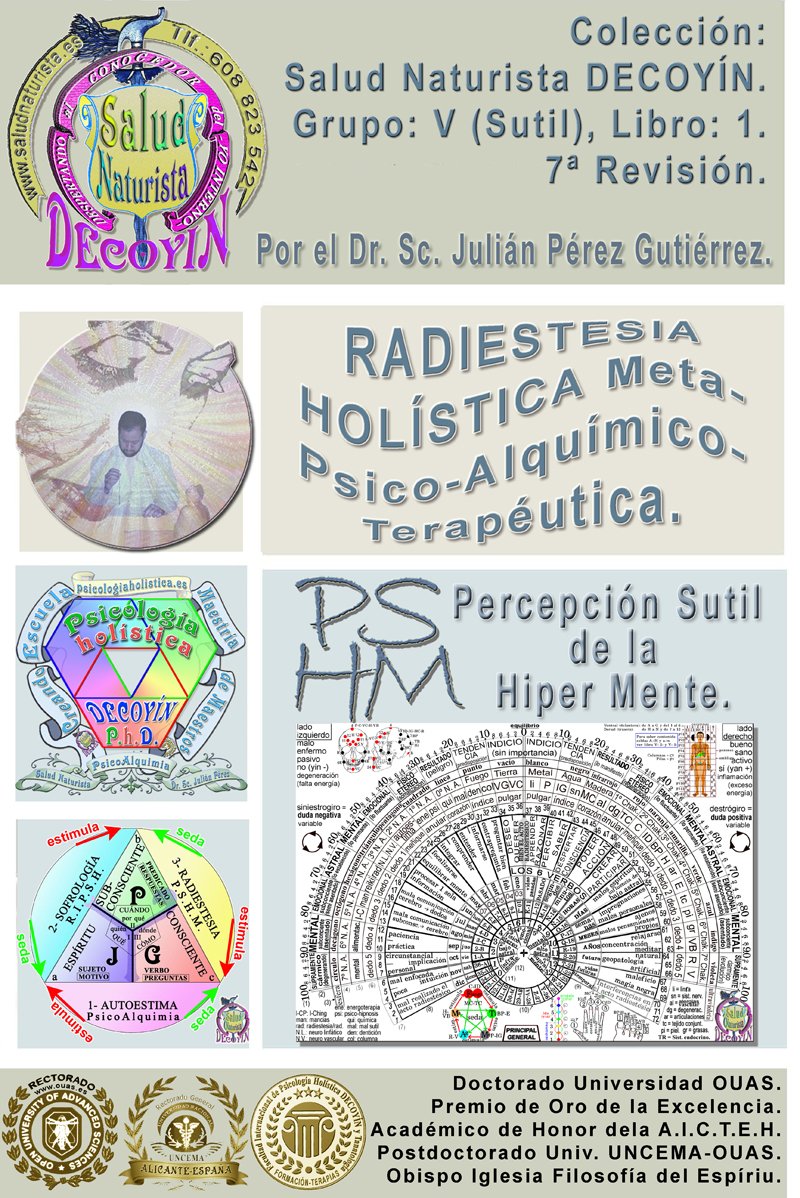 Formación en: RADIESTESIA Holística Meta-Psico-Alquímico-Terapéutica. -Percepción Sutil de la Híper Mente- https://youtu.be/eleZEZmhZSs V1Q5 - HIMNO DEL ARTE RADIESTÉSICO PSHM https://youtu.be/TumzgaIU6Xg V1W2- PRINCIPIOS DE LA RADIESTESIA PSHM https://youtu.be/YX5dPf5LTwk 0H2- TRANSCENDENCIA DE LA RADIESTESIA TERAPÉUTICA Tras casi 30 años de investigación y estudios, donde ya desde 1995 obtuve el certificado de Rodolfo Tonelli, del Padre Pilón, de Julia Valverde Mazuelas y de Simón de la Flor, para concluir con varios doctorados desde 1998 hasta el 2017, en estos temas de la Radiestesia Terapéutica y similares, en los que he ido adoptando distintos títulos, para definir lo que es para mí la radiestesia de la que enseño y hago uso. Este estudio trata así sobre la Radiestesia que ataña a todas las partes que nos componen (holística), y ello desde el entendimiento, estudio y trabajo de la Psiques (Meta-Psicología) que produce procesos de transmutación, transformando los conflictos en oportunidades de victoria (Alquimia), con el potencial para la salud que ello tiene (Terapéutica). Y todo ello desde unos sentidos no físicos (percepción sutil) que abarca más allá de lo físico espacio/temporal, de los recursos al alcance del Consciente, pues ataña a la mente superior del Subconsciente (Maestro Interior) y del Espíritu (Hipermente).